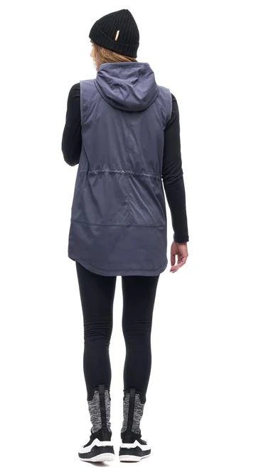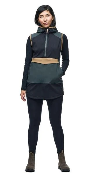 Lightweight, stretchy, moisture-wicking, fixed hood, windbreaker tunic for outdoor activities in cool temperatures. Ideal as a middle layer or outer layer. Made from a 2-way stretch nylon fabric.