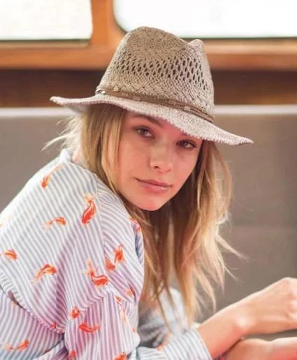 A timeless fedora built for summer weather. The women’s Regan hat features a breezy open weave made from paper straw for a molded crown and flat brim that hold their shape. A triple-cord faux-suede hatband with tarnished brass detail updates the look. Inside, a soft, stretchy band gives this hat a comfy fit.